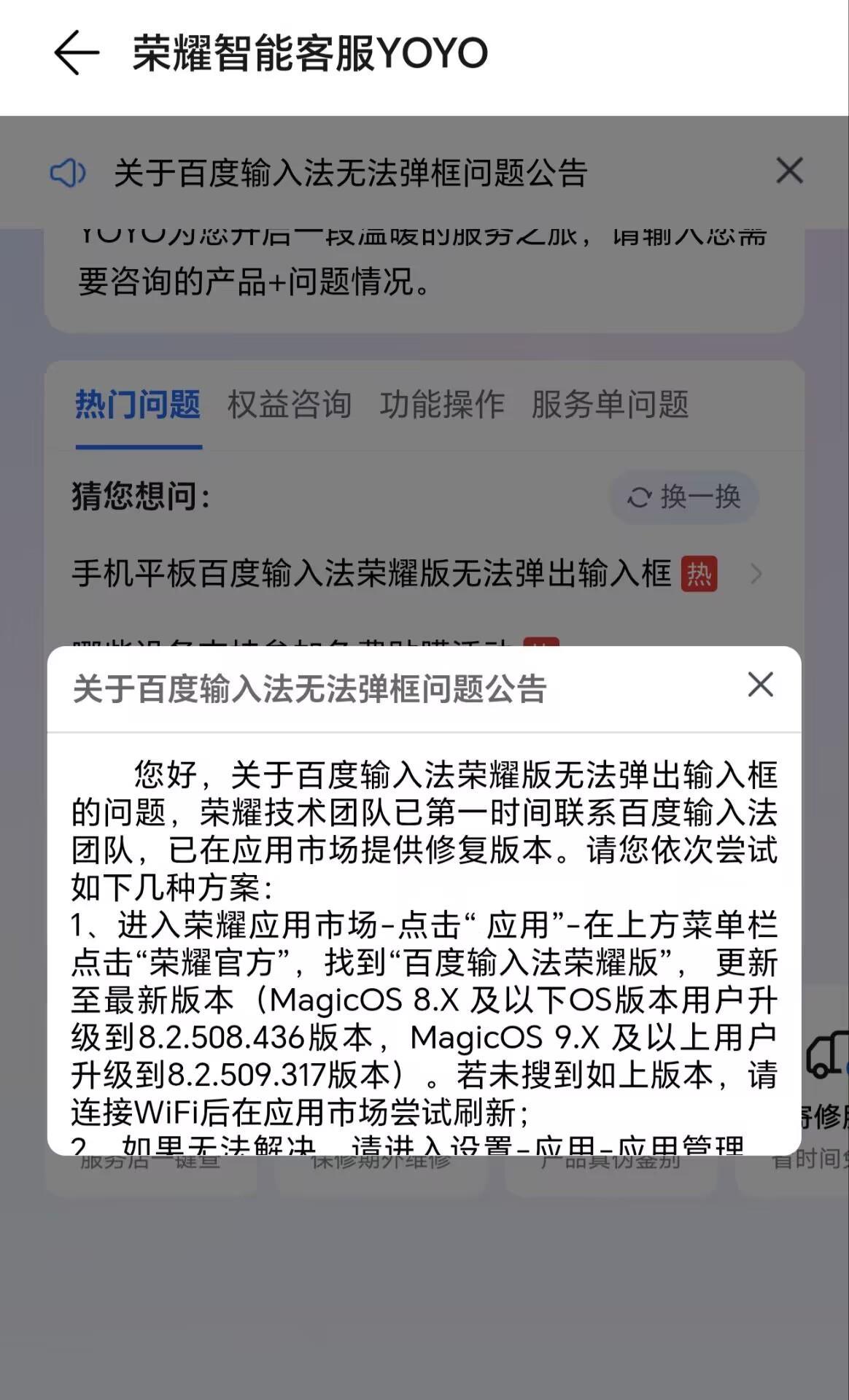 荣耀手机输入法问题导致输入框无法弹出,团队致歉并寻求解决方案 荣耀手机输入法问题导致输入框无法弹出,用户使用受限,用户反馈称在聊天时无法输入文字,给日常通讯带来不便,针对此问题,输入法团队表示道歉并正在紧急修复中,目前尚不清楚具体影响范围和原因,但团队正在全力解决这一问题,以恢复用户正常通讯体验,摘要字数控制在100-200字之间。...