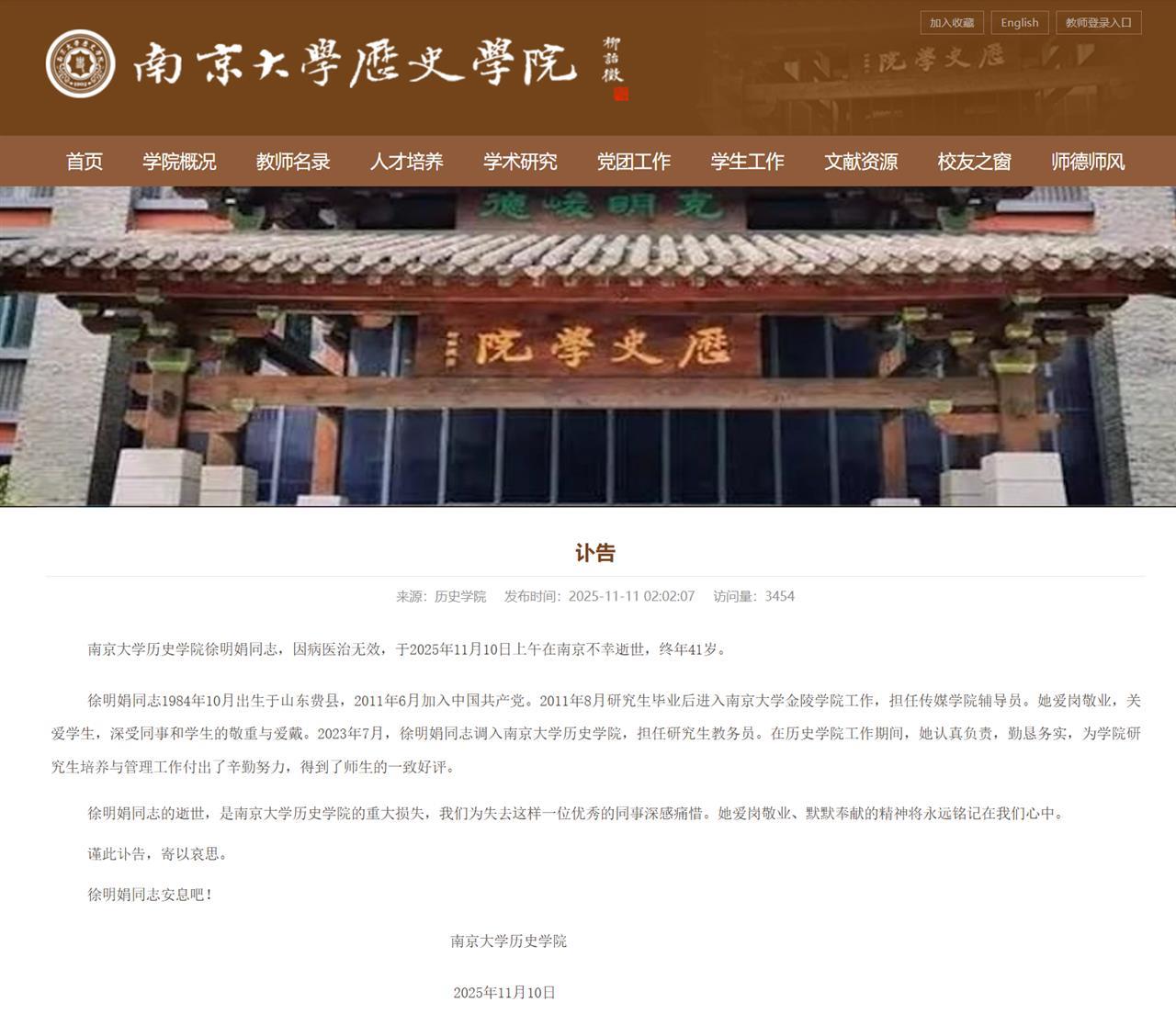 南京大学历史学院女教务员徐明娟逝世,学生哀悼其早逝,年仅41岁 南京大学历史学院女教务员徐明娟因病不幸去世,年仅41岁,她的离世让学生们倍感悲痛,纷纷表示有一种顿失故人的伤感,徐明娟为人热心,对学生们很好,她的离世令人扼腕叹息,这一消息令人深感惋惜,她的亲友和同事们也一定深感悲痛。...