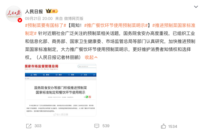 推进制定预制菜国家标准,多家媒体发文关注。(图/社交媒体截图)
