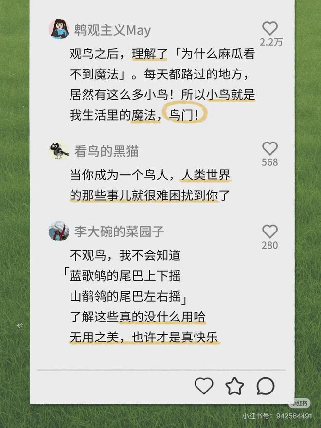 据《小红书观鸟趋势报告》,目前小红书上“观鸟”相关笔记讨论量已超过700万次,近一年“观鸟”相关的笔记发布数量也达到了过去10年总和的1.2倍。观鸟这一爱好,正在变得低门槛化、大众化、趣味化。