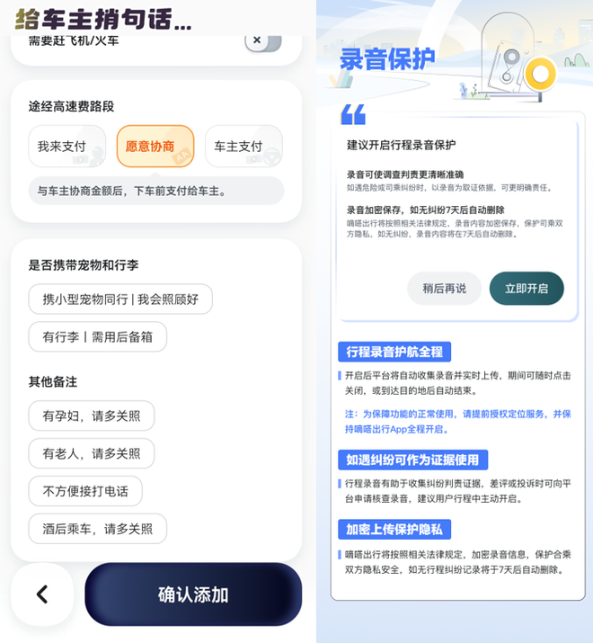 在合乘途中,嘀嗒出行建议同路人礼貌交谈,相互尊重,包容互谅,全程开启“行程录音保护”功能,多一分安心。