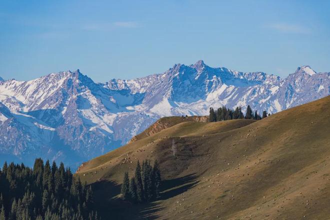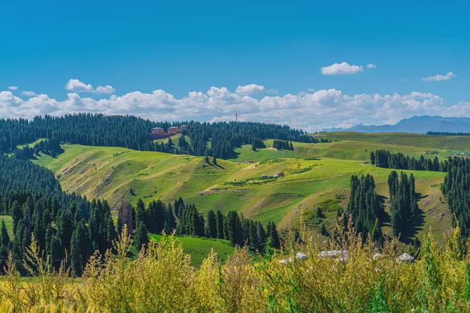 昌吉市南部的索尔巴斯陶牧场,是风光旖旎的高山草原。夏天时,无垠的碧绿草甸以及点缀其间的云杉林和牧民的毡房,形成一幅悠然宁静的画卷;到了秋季,草色转黄,与天边连绵的雪山呼应时又独有一份飒爽风韵。