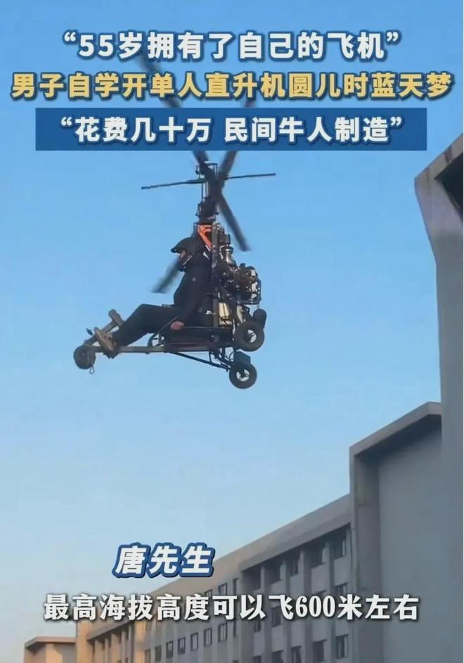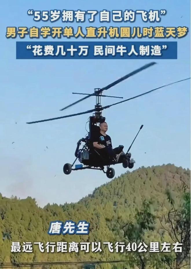 这位民间飞行爱好者,原为剑阁县某医院职工,本名唐正兴。生前,他称自己所飞行的是一款“共轴双桨超轻型飞机”,合计花费35万元,最高飞行速度100公里/小时左右,最高海拔高度可达600米。