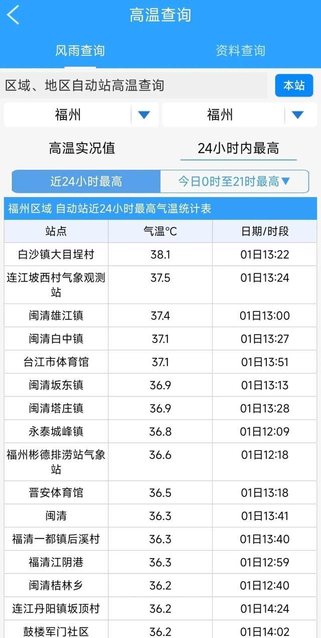 昨天,福州多地的最高温