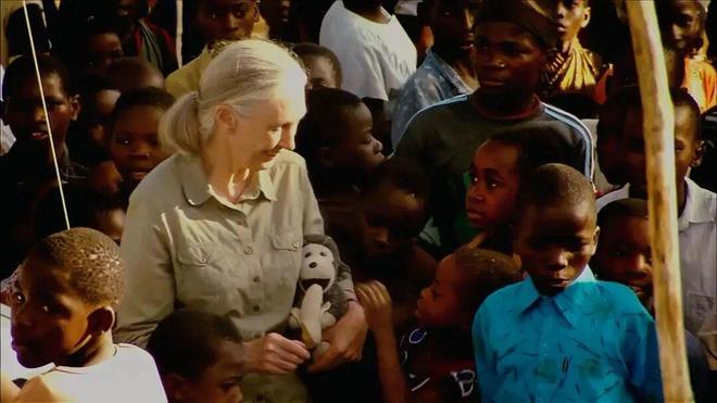 珍·古道尔与非洲的孩子们。(图/截自纪录片《珍》)