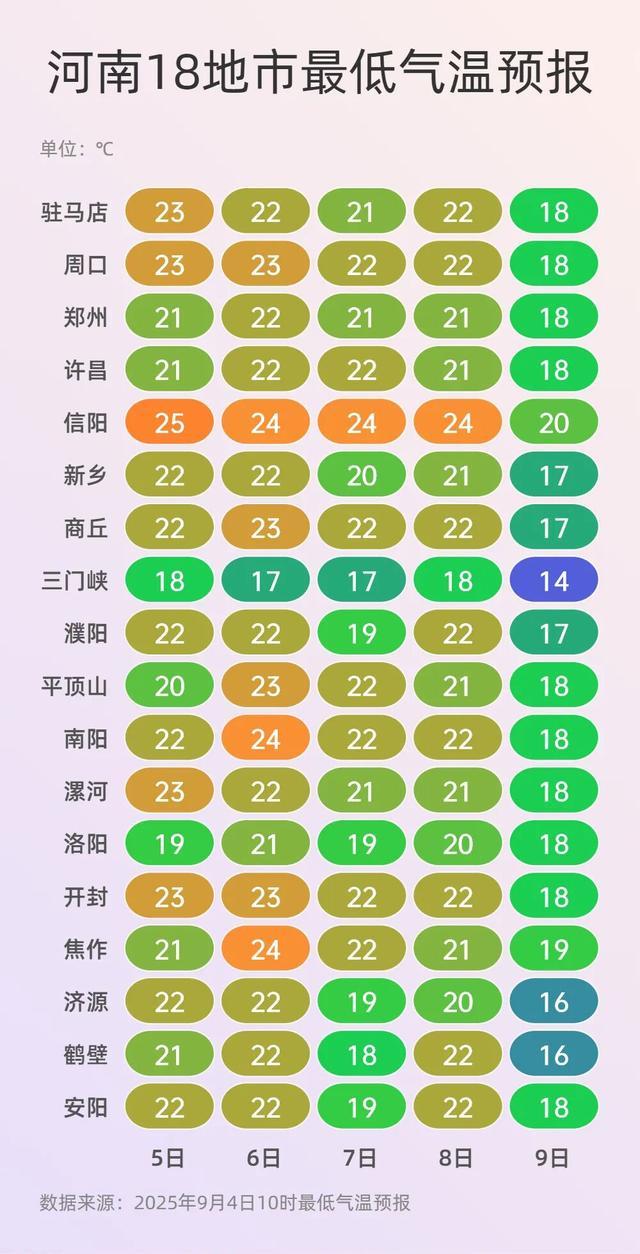 一场雨水一场凉,由于阴雨频繁,未来五天,全省大部最高气温在30℃上下,西部地区比如三门峡和洛阳不足30℃。全省大部的最低气温也多在20℃上下,在雨水的影响下,呈现缓慢下降的趋势,预计9日全省早晚气温多在17-19℃之间。秋凉逐渐显现,注意及时关注气温变化,调整着装,谨防感冒。
