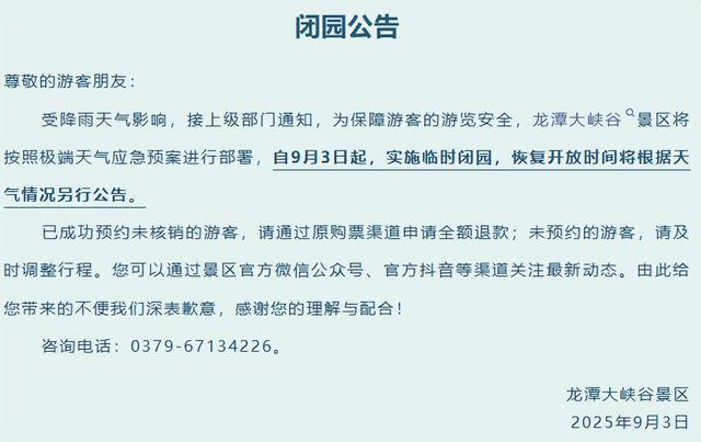 受降雨天气影响,龙潭大峡谷景区将按照极端天气应急预案进行部署,自9月3日起实施临时闭园,恢复开放时间将根据天气情况另行公告。
