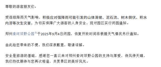 受连续降雨天气影响,积极应对强降雨可能引发的山体滑坡、泥石流、树木倒伏、积水内涝等次生灾害,为切实保障广大游客的人身安全,现对园区实行闭园通知。郑州索河郊野公园于2025年9月4日闭园,恢复开放时间将根据天气情况另行通知。