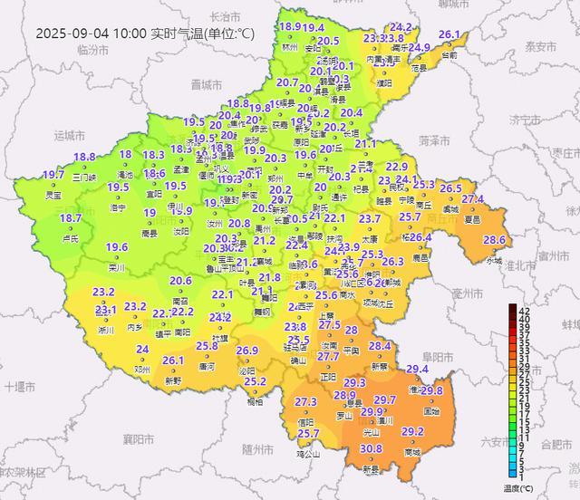 雨来气温降,自9月2日大范围雨水上线以来,我省多地最高气温跌至“2”字头,比如郑州3日白天最高气温跌至22.6℃,为今年立秋后白天气温新低。今天上午10点我省雨区的气温仅有20℃上下,加上空气湿度大,湿凉感明显,而在没有下雨的地方,气温在25-27℃,体感舒适。