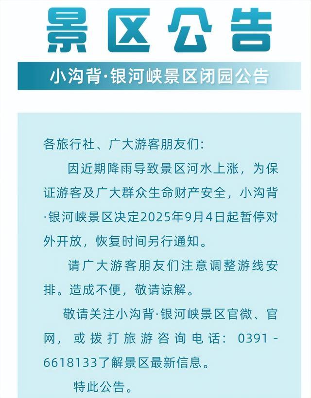 因近期降雨导致景区河水上涨,为保证游客及广大群众生命财产安全,小沟背银河峡景区决定2025年9月4日起暂停对外开放,恢复时间另行通知。