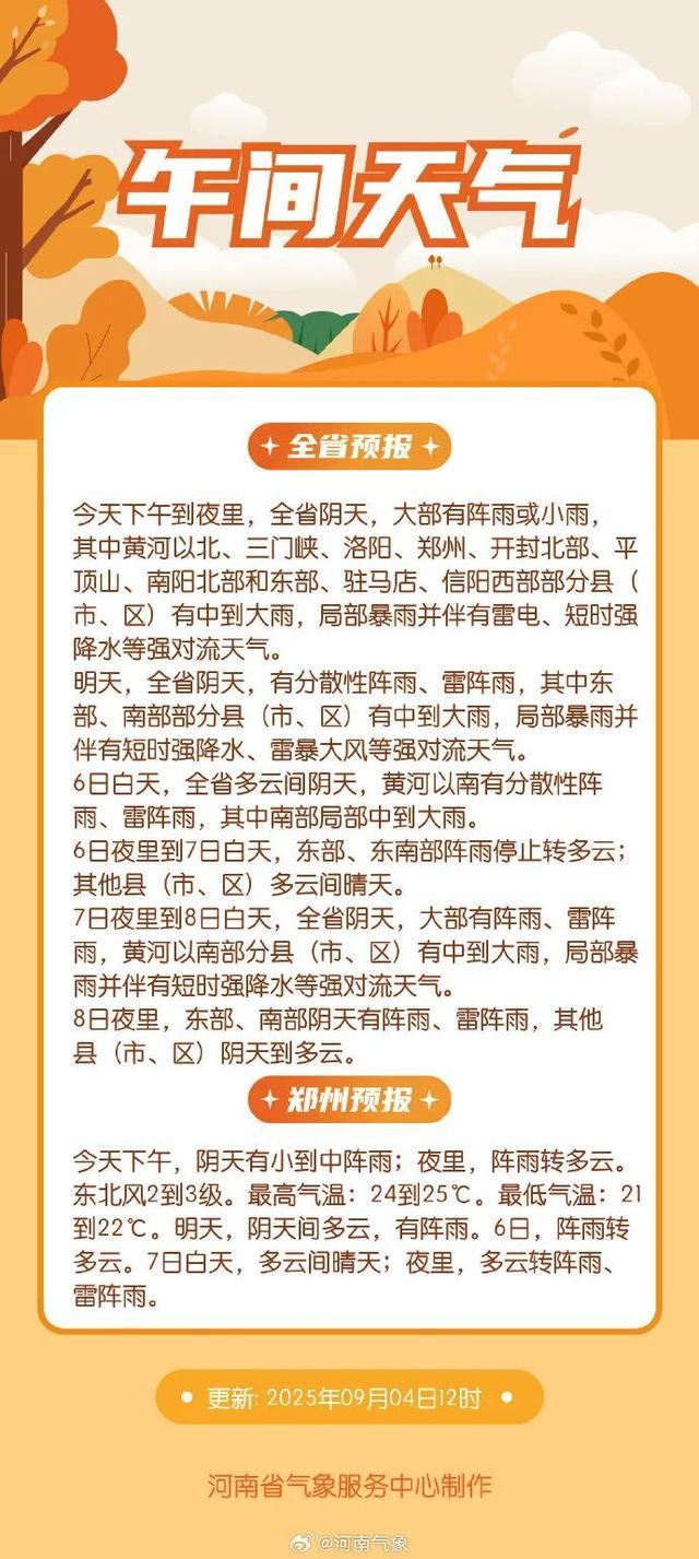 今天下午到夜里,全省阴天,大部有阵雨或小雨,其中黄河以北、三门峡、洛阳、郑州、开封北部、平顶山、南阳北部和东部、驻马店、信阳西部部分县(市、区)有中到大雨,局部暴雨并伴有雷电、短时强降水等强对流天气。