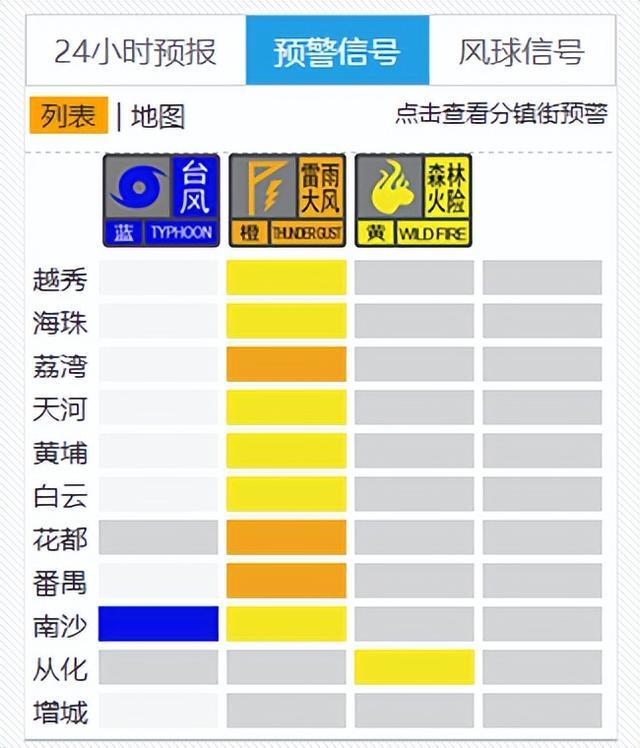 截至10时30分,广州南沙区台风蓝色,番禺、海珠、荔湾、越秀、天河、白云、黄埔、增城台风白色预警信号正在生效;广州港1号港区台风3号风球、2号港区台风2号风球、3-4号港区台风1号风球正在生效。