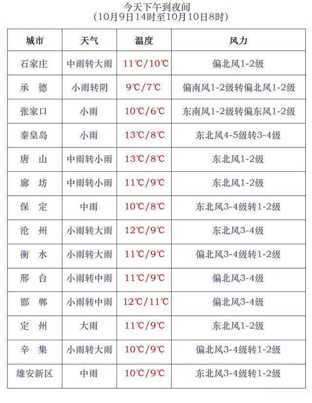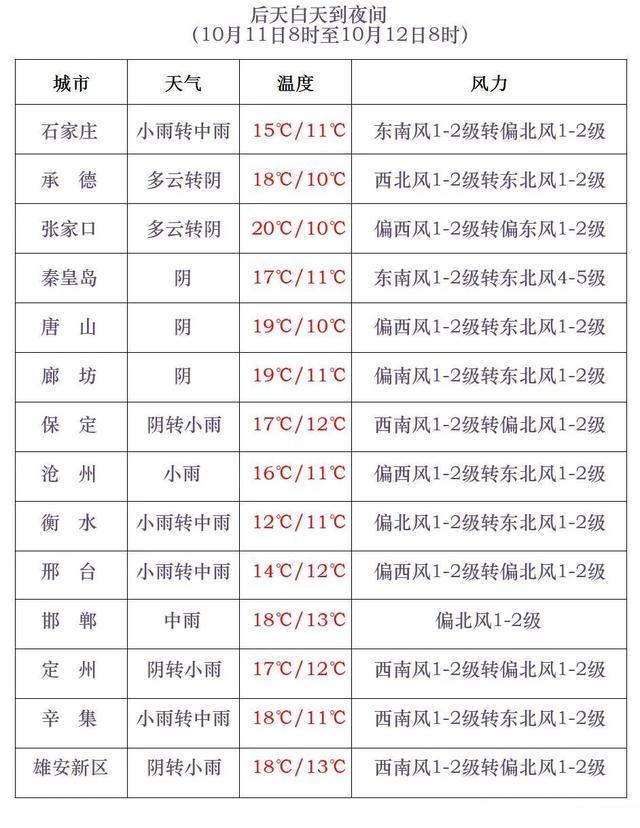 11日夜间到12日,全省阴,中南部地区有小雨到中雨,其中石家庄、沧州以南地区有大雨,局地有暴雨。12日白天,东南部地区有偏北风4到5级,阵风6到7级;渤海海域和沿海地区有东北风5到6级,阵风7到9级。