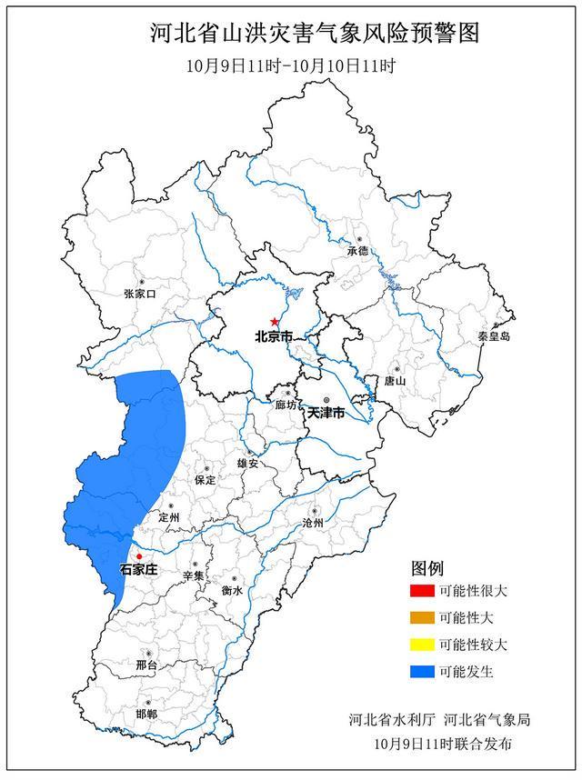 预计,10月9日11时至10月10日11时,保定市(曲阳县、唐县、阜平县、顺平县、满城区、涞源县、易县、涞水县)、石家庄市(赞皇县、井陉县、元氏县、鹿泉区、井陉矿区、平山县、灵寿县、行唐县)、张家口市(蔚县、涿鹿县)等地局地可能发生山洪灾害(蓝色预警)。其他地区也可能因局地短历时强降水引发山洪灾害,请各地密切关注降雨情况,强化山洪灾害监测,及时发布预警信息,提前组织群众转移避险,确保人民群众生命安全。