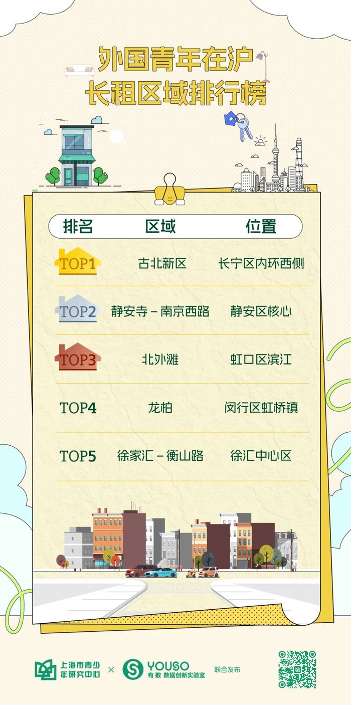 外国青年在沪长租更看重区域内国际社区配置、生活配套服务和年轻化氛围。数据显示,古北新区、静安寺-南京西路区域、虹口北外滩、闵行龙柏、徐家汇-衡山路区域位列外国青年在沪长租区域排行TOP5。