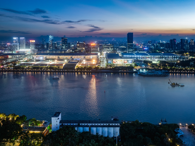 从珠江新城往下游仅仅数公里,广交会展馆如祥云覆盖,总面积超过162万平方米,是全球规模最大的会展综合体。每到夜晚,广交会展馆附近的互联网公司总部大厦亮起灯来,与珠江新城和金融城隔江呼应。