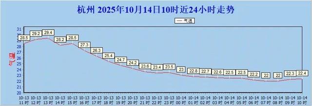 不仅仅是最高气温,下图是近24小时杭州站的小时气温走势,我们可以看到,从昨天18时起,杭州的气温就跌至26℃以下,至今天(14日)10时,整点气温依然只有22℃多,这不就是天然的空调房温度?