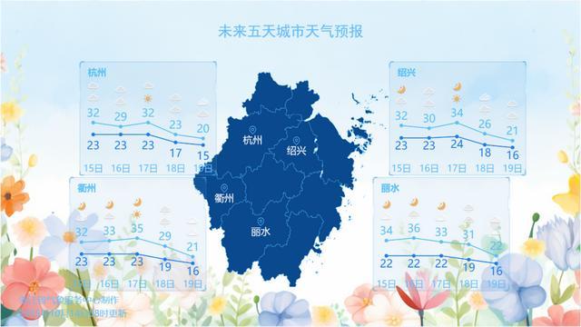 明天:浙北和沿海地区多云到阴有时有阵雨,其它地区多云。午后全省有分散性阵雨或雷雨。