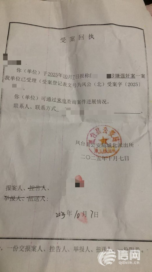 从王女士提供的落款为凤台县公安局城北派出所的受案回执单上,可看到:“你(单位)2025年10月报称的XX涉嫌强奸一案我单位已受理。”信号新闻从淮南市凤台县刑事侦查大队获悉,目前涉事男子已被控制,案件正在调查中。而淮南市凤台县城北派出所则在调查女子在全季酒店登记的具体时间。