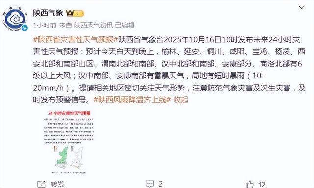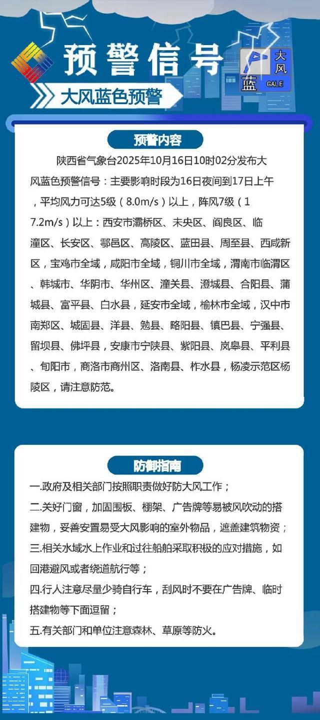 预计2025年10月16日08时至2025年10月17日08时,西安市长安区、蓝田县,汉中市南郑区、西乡县、镇巴县,安康市汉滨区、汉阴县、石泉县、紫阳县、岚皋县、平利县、镇坪县、旬阳市、白河县,商洛市商州区、丹凤县、镇安县等县(市、区)发生山洪灾害可能性较大(黄色预警),西安市鄠邑区、周至县,宝鸡市渭滨区、金台区、陈仓区、眉县、太白县,咸阳市永寿县,渭南市华州区、富平县、华阴市,延安市宝塔区、安塞区、延长县、志丹县、吴起县、子长市,榆林市横山区、靖边县、定边县,汉中市城固县、洋县、勉县、宁强县、佛坪县,安康市宁陕县,商洛市洛南县、商南县、山阳县、柞水县等县(市、区)有可能发生山洪灾害(蓝色预警)。请各地各部门落实防御责任,紧盯危险区与强降雨重叠区,加强实地监测与预警叫应,提前做好转移避险防范。