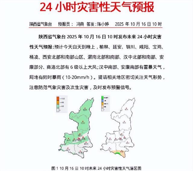 预计2025年10月16日08时至2025年10月17日08时,西安市长安区、蓝田县,汉中市南郑区、西乡县、镇巴县,安康市汉滨区、汉阴县、石泉县、紫阳县、岚皋县、平利县、镇坪县、旬阳市、白河县,商洛市商州区、丹凤县、镇安县等县(市、区)发生山洪灾害可能性较大(黄色预警),西安市鄠邑区、周至县,宝鸡市渭滨区、金台区、陈仓区、眉县、太白县,咸阳市永寿县,渭南市华州区、富平县、华阴市,延安市宝塔区、安塞区、延长县、志丹县、吴起县、子长市,榆林市横山区、靖边县、定边县,汉中市城固县、洋县、勉县、宁强县、佛坪县,安康市宁陕县,商洛市洛南县、商南县、山阳县、柞水县等县(市、区)有可能发生山洪灾害(蓝色预警)。请各地各部门落实防御责任,紧盯危险区与强降雨重叠区,加强实地监测与预警叫应,提前做好转移避险防范。