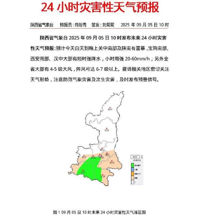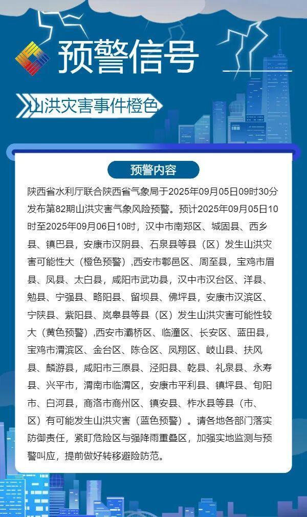 预计2025年09月05日10时至2025年09月06日10时,汉中市南郑区、城固县、西乡县、镇巴县,安康市汉阴县、石泉县等县(区)发生山洪灾害可能性大(橙色预警),西安市鄠邑区、周至县,宝鸡市眉县、凤县、太白县,咸阳市武功县,汉中市汉台区、洋县、勉县、宁强县、略阳县、留坝县、佛坪县,安康市汉滨区、宁陕县、紫阳县、岚皋县等县(区)发生山洪灾害可能性较大(黄色预警),西安市灞桥区、临潼区、长安区、蓝田县,宝鸡市渭滨区、金台区、陈仓区、凤翔区、岐山县、扶风县、麟游县,咸阳市三原县、泾阳县、乾县、礼泉县、永寿县、兴平市,渭南市临渭区,安康市平利县、镇坪县、旬阳市、白河县,商洛市商州区、镇安县、柞水县等县(市、区)有可能发生山洪灾害(蓝色预警)。请各地各部门落实防御责任,紧盯危险区与强降雨重叠区,加强实地监测与预警叫应,提前做好转移避险防范。
