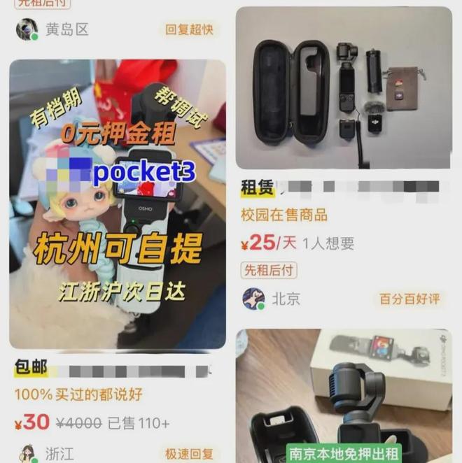 “20块一天,即租即用,立省三千。”爱旅游的白领小鱼告诉我们,她今年已经多次通过闲鱼、爱租机等二手租借平台租借运动相机,包括一度被调侃为“电子茅台”的大疆Osmo Pocket 3和“i人自拍神器”影石360 Go3S,以及这个品类的祖师爷Go Pro。
