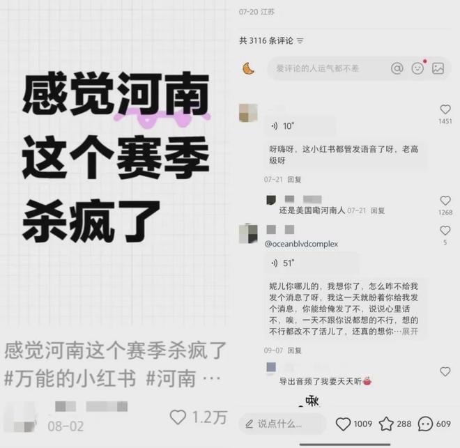 今年,小红书推出评论区可发语音的功能后,不少网友开始用方言交流,这同样给河南话叠加了“出圈buff”。截至2025年9月,“河南话”标签在小红书上已有1.6亿次浏览量。有网友发帖,仅凭一句“感觉河南在这个赛季杀疯了”就喜提1.2万个赞,下方第一条评论附和道:“我最近天天在各种评论区听河南人说话,真的很好听。”