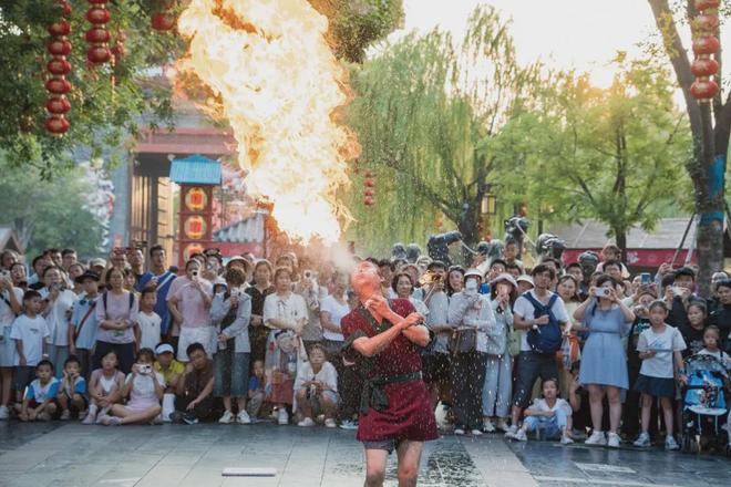2025年7月22日,河南开封。清明上河园内,游客在观看表演。(图/CFP)