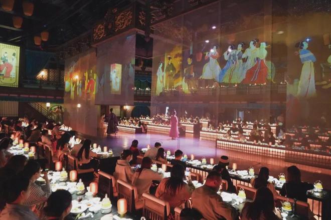 2025年9月26日,以大宋文化为创作背景的沉浸式宋文化主题餐秀“清明上河·宋宴”在清明上河园上演,裸眼 3D光影呈现的古代画面吸引顾客观看。(图/夏青华/中新社)