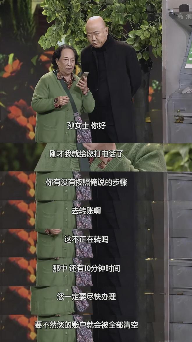 2017年北京春晚小品《取钱》中,电诈分子以河南口音来电的相关片段。