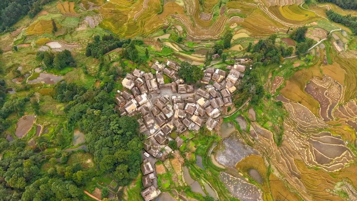 村寨之中,金黄的稻谷、火红的辣椒、橙黄的玉米铺在蘑菇房顶,村民忙碌的身影穿梭其中。