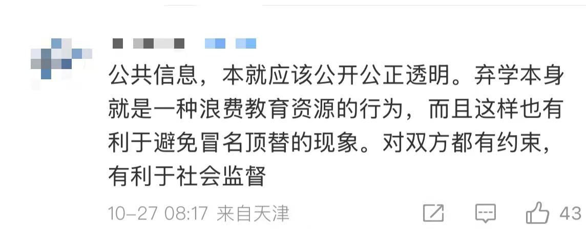 东华大学公示43名学生姓名的公告,也引发了广大网友的讨论,相关词条冲上热搜。究竟校方在新生放弃入学公告上能否公布学生姓名呢?有网友认为,“公布具体名单显得有些‘小家子气’”,也有网友认为,“公共信息本就应该公正透明”。
