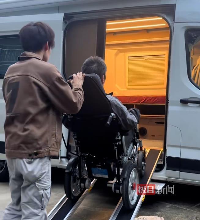视频中,小郭将母亲从床上抱起,再转身将母亲轻轻放至轮椅上,动作既轻快又娴熟。他在新购置的房车内,给母亲改造了一张护理床;经加装在车旁的坡道板,坐在轮椅上的母亲能被轻松推上房车;房车副驾驶的座位旋转180度后,母亲还能在车内蹬康复自行车。