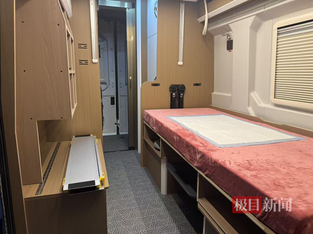 这辆房车是郭求生精心为母亲设计的:加宽的车门和加装的坡道板能让母亲的轮椅进出房车;可以旋转的副驾驶座椅配上康复自行车,方便母亲在车内做康复训练;车内原本只有40多公分高的桌椅经郭求生的木匠之手,变成了一张60多公分高的护理床。