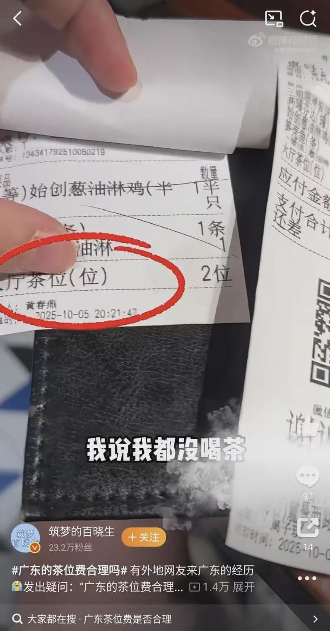 继“8个月婴儿没喝茶被收茶位费”登上微博热搜榜之后,茶位费话题在社交平台持续引发讨论。一名今年国庆长假期间来广州旅游的游客在视频中如此提问:“广州的家人们,你们觉得收茶位费这个事真的合理吗?”随后,“广东的茶位费合理吗”在10月中旬成为热搜话题。