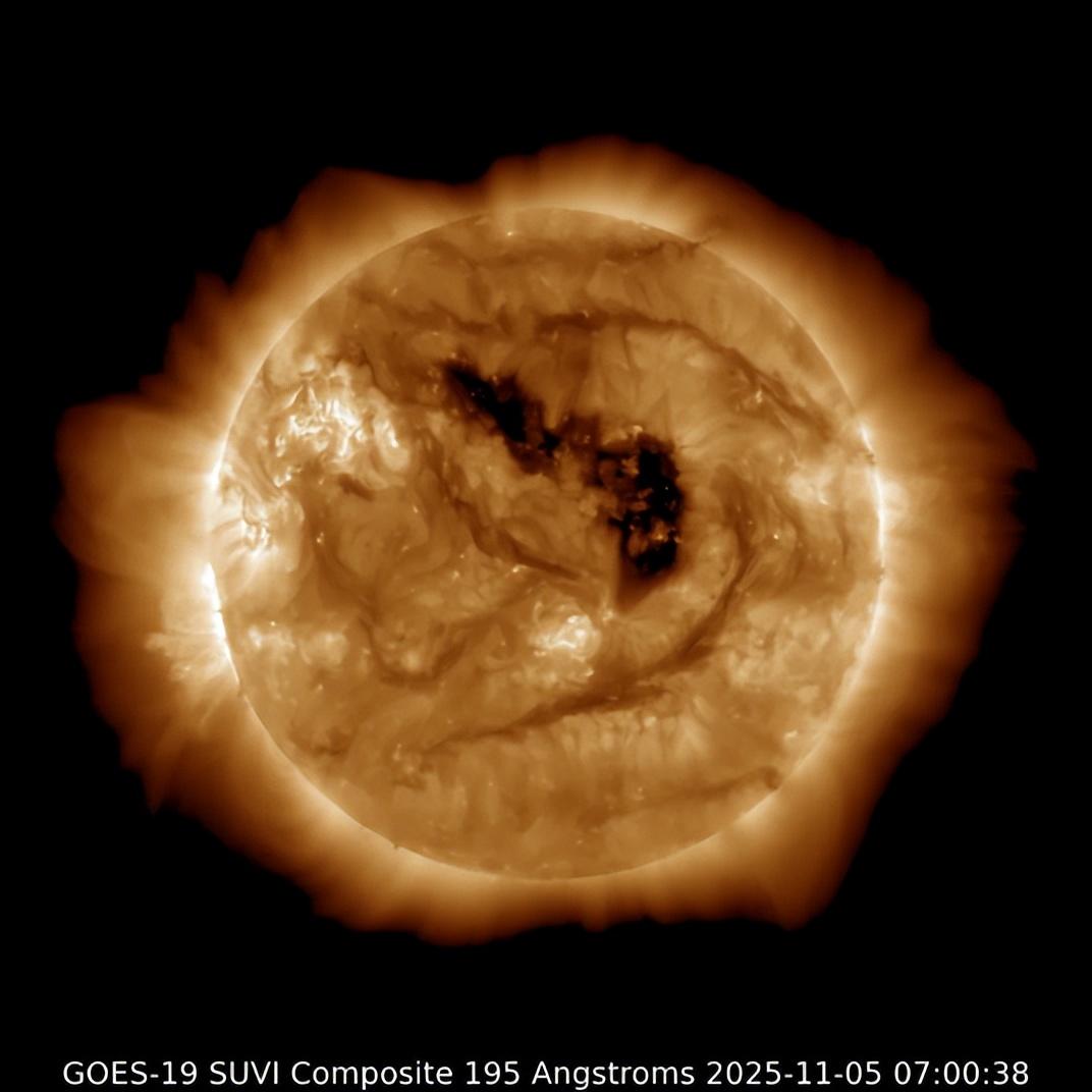 195埃波段下看到的太阳,其中深棕色区域就是冕洞。