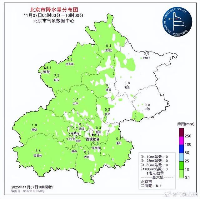 目前雨势较为平缓,截至今天10时,全市平均降水量0.9毫米,城区平均0.4毫米,最大降水量在延庆二海坨8.1毫米。