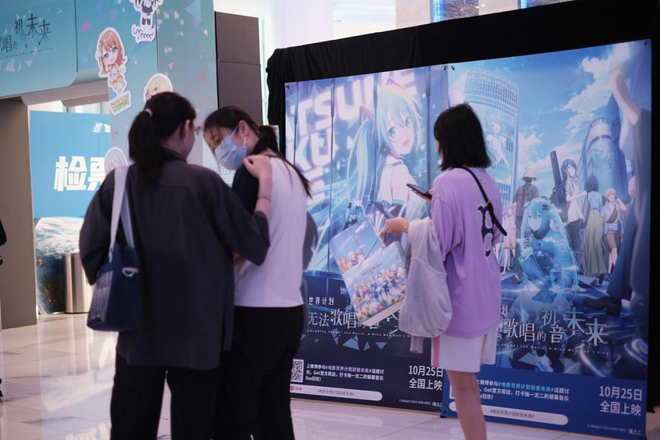 10月18日那天,在广州动漫新城附近的一家影院,出现了一片标志性的“初音绿”。数十位身着初音未来经典水手服、发梢别着同色系发带的粉丝,把电影院变成了一个小型的“同好”现场。