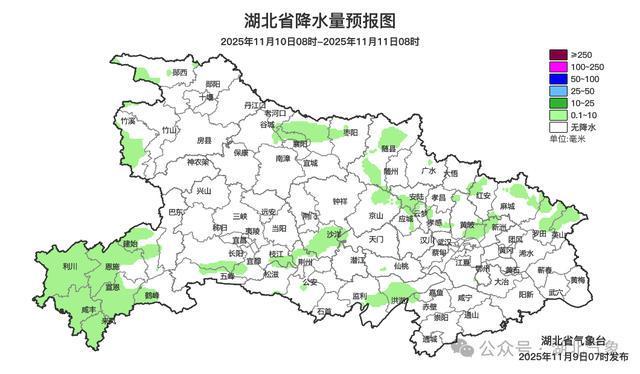 11月9日08时-10日08时,鄂西南、江汉平原、鄂东南阴天有小到中雨;鄂东北阴天有小雨;其他地区阴天,局地有零星小雨。最高气温14~18℃,最低气温西部9~13℃、中东部13~15℃,偏北风3级、阵风4到5级。