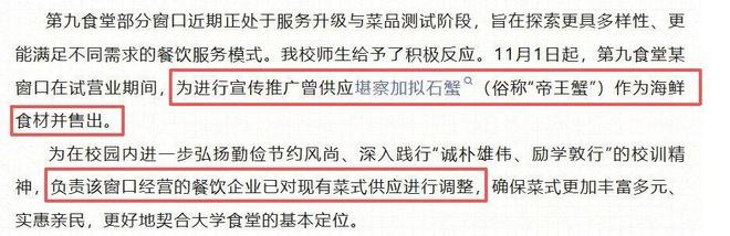 南大后勤部门在《关于我校第九食堂某窗口销售菜品的情况说明》中解释,第九食堂窗口推出的帝王蟹,只是试业推广,“近年来,我们始终以服务师生为中心,持续推出一系列保供稳价举措,努力让大家‘吃得放心、吃得好’。其中,1分钱暖心早餐、7/8/10元的小蓝鲸学子套餐、0.4/0.8元平价素菜、甜/咸两种免费汤品、1.5元阳春面/蛋炒饭、超值早餐套餐、自助调料台等,得到了师生的认可;‘深夜食堂’‘你来点菜我来做’等主题美食活动得到师生的欢迎。”