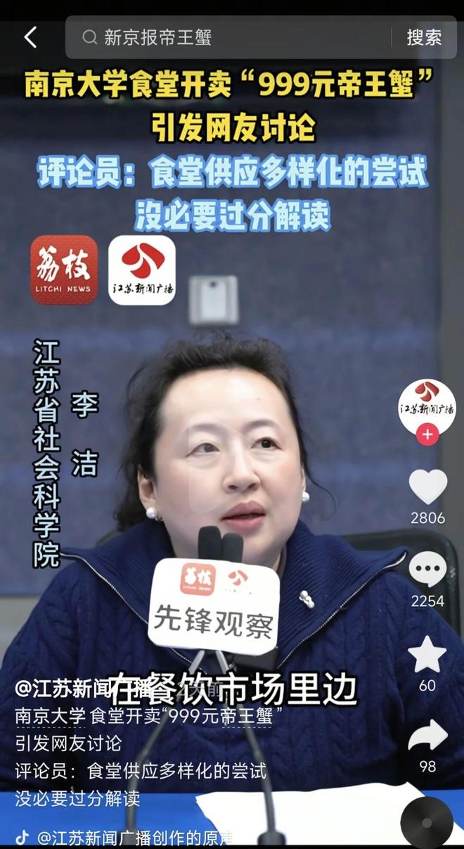 “999元帝王蟹”本身就是一个极具冲击力的标签,它一出现,就迅速抽离了具体语境。比如,这只是第九食堂一个市场化窗口的尝试、每天只限量供应一只、南大十多个食堂大量平价菜品等等,被简化成一个刺眼的符号:“大学食堂居然在卖天价菜”。这种标签化的传播,天然就容易点燃情绪。