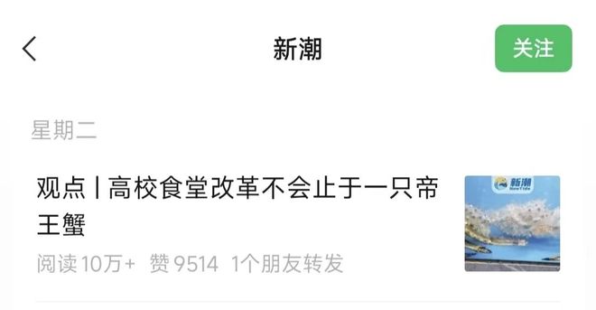 南京大学新闻传播学院的学生在“新潮”公众号上奋笔疾书,写下《高校食堂改革不会止于一只帝王蟹》的雄文,流量迅速突破十万加。