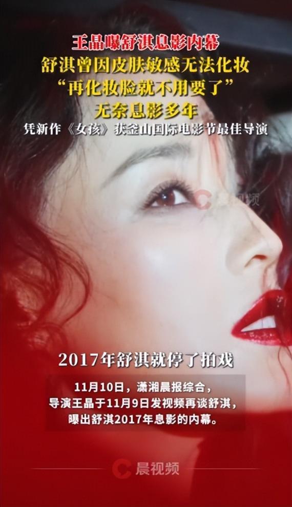 11月9日,导演王晶于发视频再谈演员舒淇 ,曝出舒淇2017年息影的内幕,王晶称,在2017年的时候,舒淇脸部变得非常敏感,一化妆面部就红肿得厉害,医生告知舒淇如果继续化妆“脸就不用要了”,因此,舒淇不得不暂停几年不去接戏,近几年皮肤养好后才回归拍戏,不过也没有拍很多。