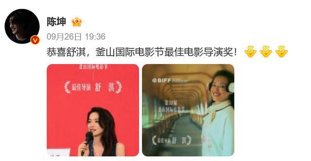 陈坤发文:“恭喜舒淇,釜山国际电影节最佳导演奖!”