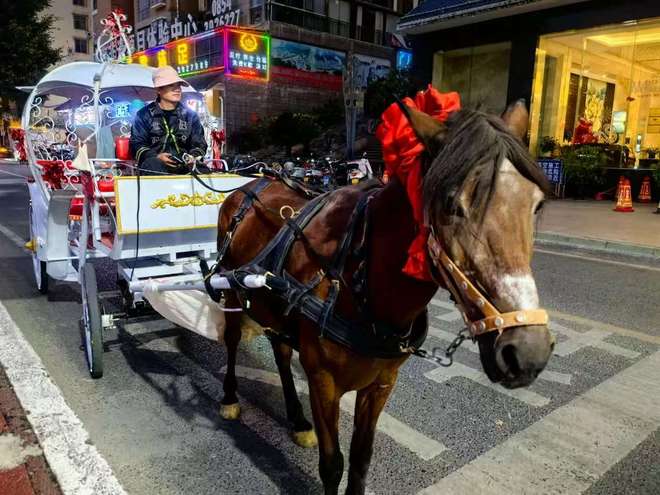 三都的马路上运营的“马车公交”,5元一程。(图/木木 摄)