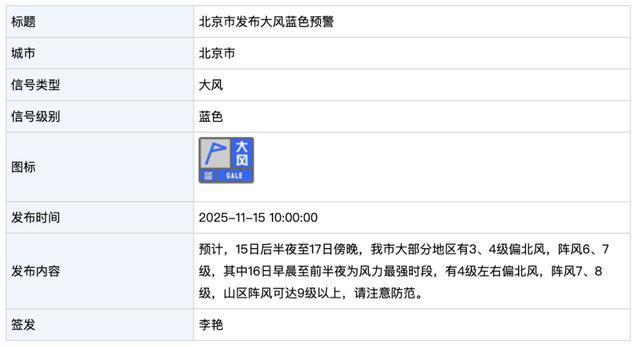 北京市气象局11月15日10时发布大风蓝色预警:预计,15日后半夜至17日傍晚,我市大部分地区有3、4级偏北风,阵风6、7级,其中16日早晨至前半夜为风力最强时段,有4级左右偏北风,阵风7、8级,山区阵风可达9级以上,请注意防范。