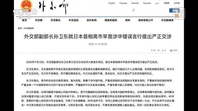 本周四,中国外交部副部长孙卫东奉示召见日本驻华大使,就高市早苗涉华错误言行提出严正交涉。中方再次敦促日方深刻反省历史罪责,立即反思纠错,收回恶劣言论,不要在错误的道路上越走越远,否则一切后果必须由日方承担。