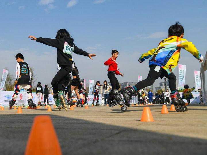 在四川省成都市东安湖公园,小朋友在练习轮滑。新华社记者 王曦 摄