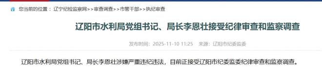 辽阳市水利局党组书记、局长李恩壮涉嫌严重违纪违法,目前正接受辽阳市纪委监委纪律审查和监察调查。